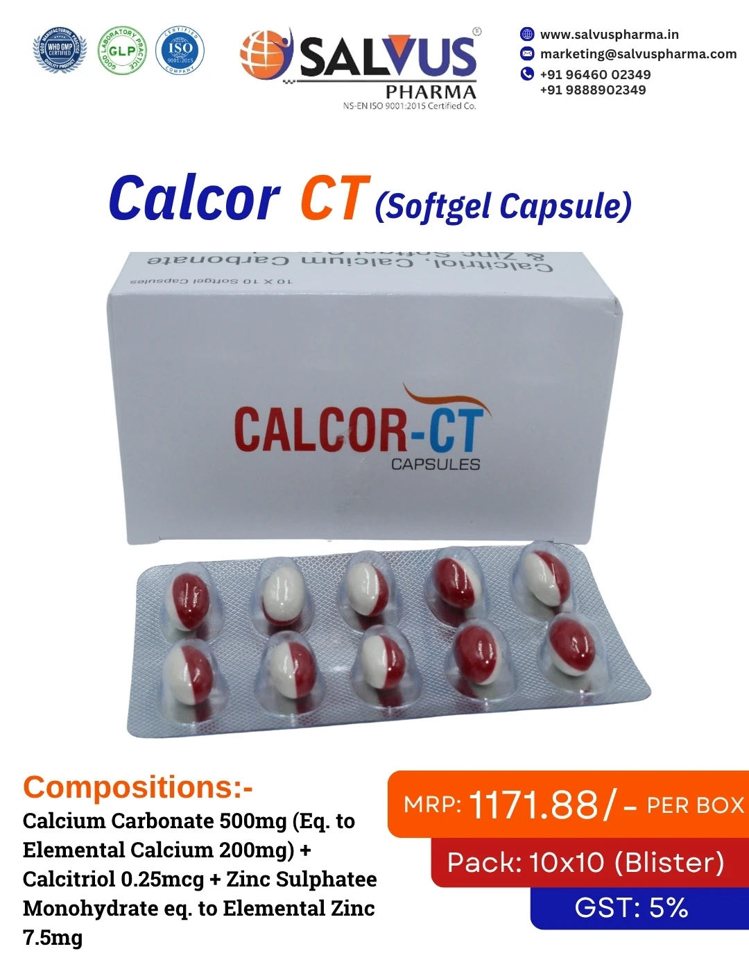 Calcitriol, Calcium Carbonate, and Zinc Softgel Capsules – Salvus Pharma manufactured Calcitriol, Calcium Carbonate, and Zinc Softgel Capsules and offered them with the brand name Calcor CT.